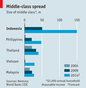 Pertumbuhan ekonomi Indonesia yang baik, rata-rata 6,4%, menjadikan kelas menengah Indonesia tumbuh signifikan. Pendapatan per kapita penduduk Indonesia tahun 2010 mencapai USD 3000, sebuah angka keramat untuk tinggal landas, tahun 2014 di perkirakan pendapatan perkapita Indonesia mencapa USD 5000.