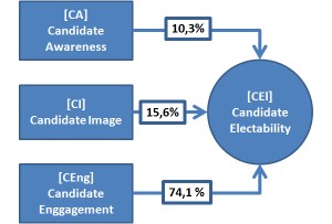 Indikator – indikator itu adalah: Candidate Awareness [CA], mengukur seberapa kuat para pemilih mengenal kandidat. Candidate Image [CI], mengukur seberapa baik persepsi pemilih terhadap kandidat. CI diukur berdasar persepsi terhadap kualitas dan kapabilitas kandidat. Candidate Enggagement [CEng], mengukur seberapa kuat kedekatan hubungan antara pemilih dan kandidat. Candidate Electability [CEl], mengukur seberapa kuat keinginan pemilih dalam memilih kandidat tertentu- Berdasarkan empat indikator tersebut terlihat jelas JOKOWI sangat unggul di kelas menengah Jakarta. Dengan menggunakan skala 1 – 6, terlihat bahwa FOKE hanya bisa mendekati JOKOWI di indikator Candidate Awareness [CA]. Sementara di indikator yang lain, rentang nilainya antara FOKE dan JOKOWI semakin tinggi.