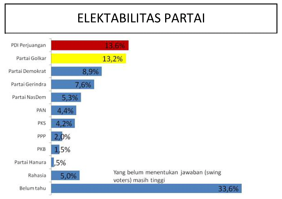 PDI Perjuangan dan Partai Golkar akan bersaing ketat dalam memperebutkan suara tertinggi pemilu, sementara suara Partai Demokrat di prediksi akan turun signifikan di banding tahun 2009- Dibanding partai lain, loyalitas pemilih Partai Demokrat sangat rendah, hanya 28,8 pemilih Demokrat tahun 2009 yang akan memilih kembali Partai Demokrat
