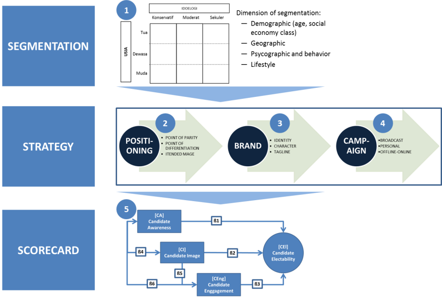 Padahal dengan memiliki strategi pemasaran politik yang tepat, partai/kandidat memiliki panduan dan arah yang jelas untuk memaksimalkan segala sumber daya yang dimiliki dalam memikat suara pemilih. Menurut saya ada 5 tahap penting dalam penyusunan strategi pemasaran politik yang saya kategorikan dalam 3 kelompok besar yaitu Segmentation, Strategy, dan Scorecard (3S).