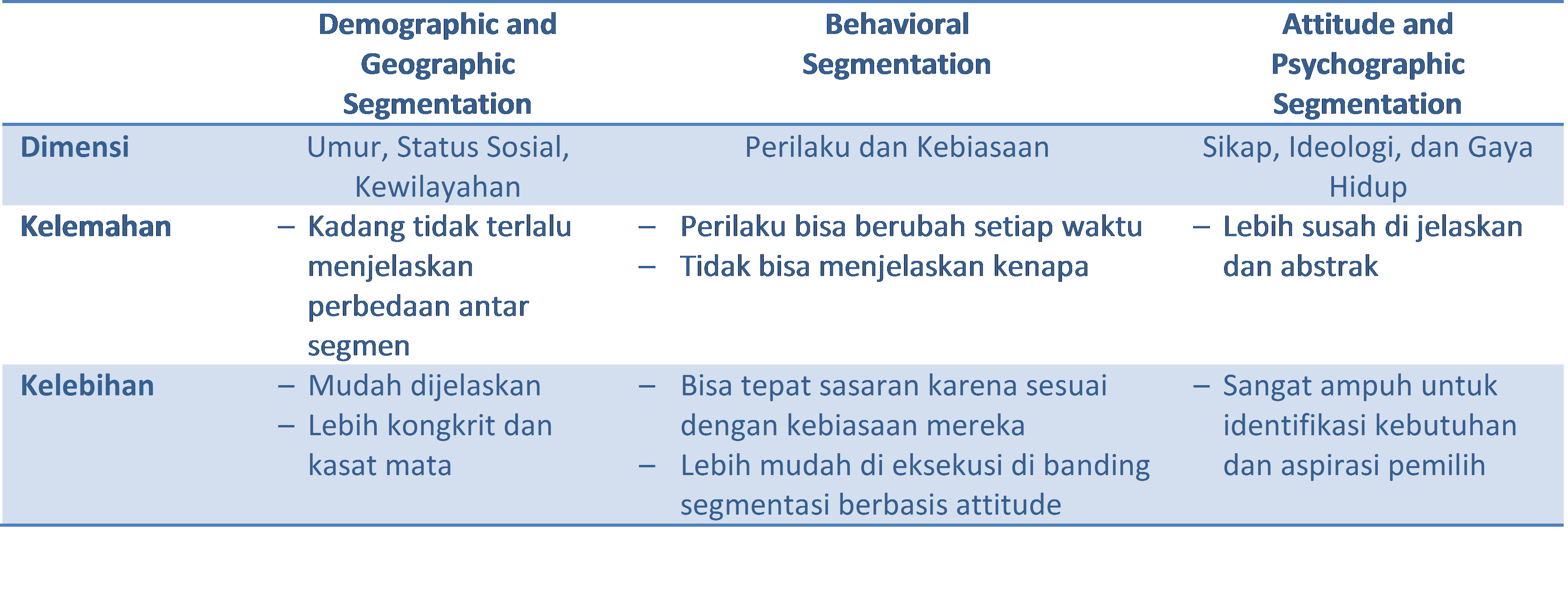 Demographic and Geographic Segmentation, segmentasi ini berbasis indikator-indikator demografi, misal umur (muda, dewasa, tua), status ekonomi (miskin, menengah, kaya), pekerjaan (buruh, pekerja swasta, professional), agama (moslim, non muslim), etnis (jawa vs non jawa) dan geografi (kota vs desa, jawa vs luar jawa), dan lain-lain.