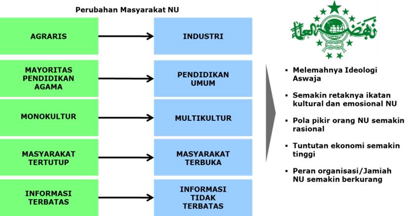 Secara garis besar perubahan sosial-budaya di masyarakat NU bisa dilihat pada gambar berikut. Arus perubahan ini paling signifikan didorong oleh setidaknya dua faktor yaitu migrasi besar-besaran masyarakat NU dari desa ke kota dan semakin meningkat dan beragamnya pendidikan masyarakat NU. Selain Itu semakin meningkatnya akses informasi terutama melalui media televisi dan internet juga semakin memperkaya cakrawala berpikir masyarakat NU.