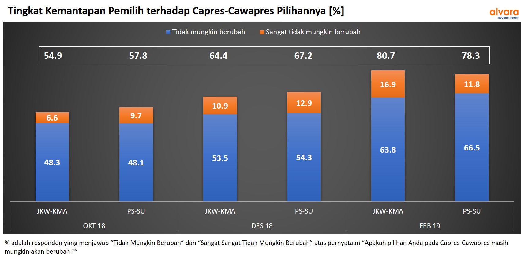 Berdasarakan data survei bulan Oktober 2018, Desember 2018, dan Februari 2019 terlihat bahwa semakin mendekati hari pemilu, kemantapan pemilih terhadap capres yang dipilih semakin tinggi, bahkan survei bulan Februari 2019 pemilih yang sudah tidak mungkin berubah sudah mencapai 80%. Dari sini kita bisa melihat bahwa pemilih semakin solid dengan pilihannya.