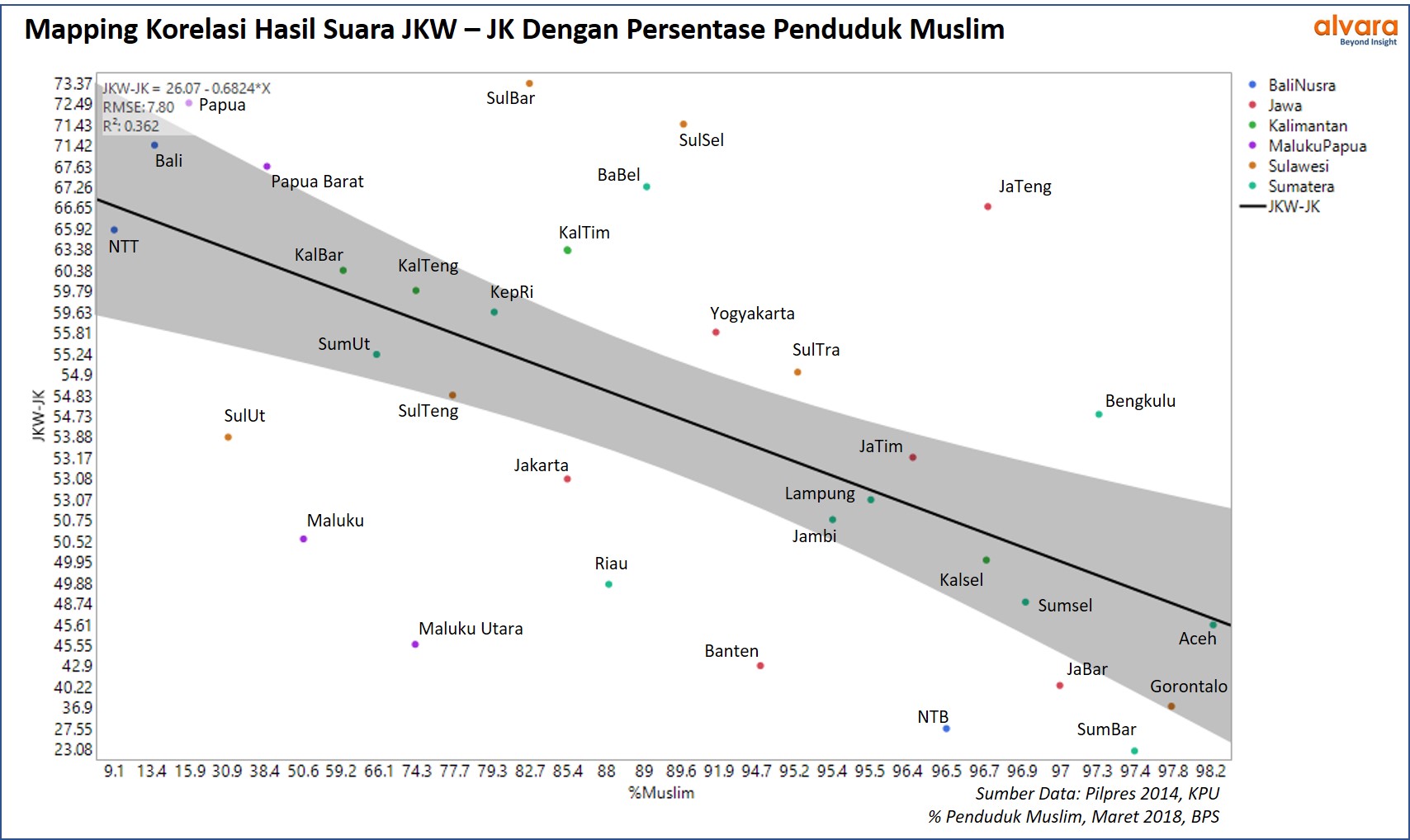 Dalam scatter plot antara perolehan suara Joko Widodo – Jusuf Kalla tahun 2014 dan persentase penduduk muslim, korelasi antara perolehan suara Joko Widodo – Ma’ruf Amin dengan persentase penduduk muslim, secara statistik korelasinya sebesar -0.37. dan ketika dibuat regresi linear sederhana, ternyata nilai R2 nya juga cukup tinggi, 0.36.