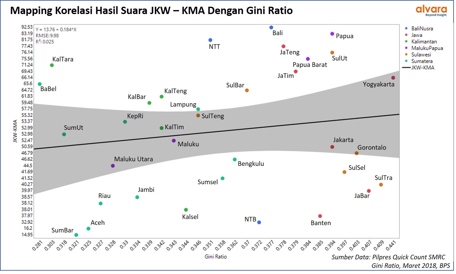 Dalam scatter plot antara perolehan suara Joko Widodo – Ma’ruf Amin dan Gini Ratio terlihat bahwa tidak ada korelasi yang kuat antara perolehan suara Joko Widodo – Ma’ruf Amin dengan Gini Ratio, secara statistik korelasinya memang kecil, hanya sebesar 0.18. dan ketika dianalisis menggunakan regresi linear sederhana, ditemukan nilai R2 nya sangat kecil, hanya 0.025.