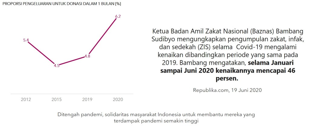 Fenomena solidaritas masyarakat Indonesia ini terekam dalam hasil survei yang dilakukan oleh Alvara Research Center bulan Juni 2020, proporsi pengeluaran untuk donasi meningkat dibanding sebelum pandemi, hal ini juga terkonfirmasi dari laporan beberapa lembaga amil zakat dan donasi yang menyebutkan selama pandemi ada peningkatan cukup tajam donasi yang berhasil mereka kumpulkan dari masyarakat.