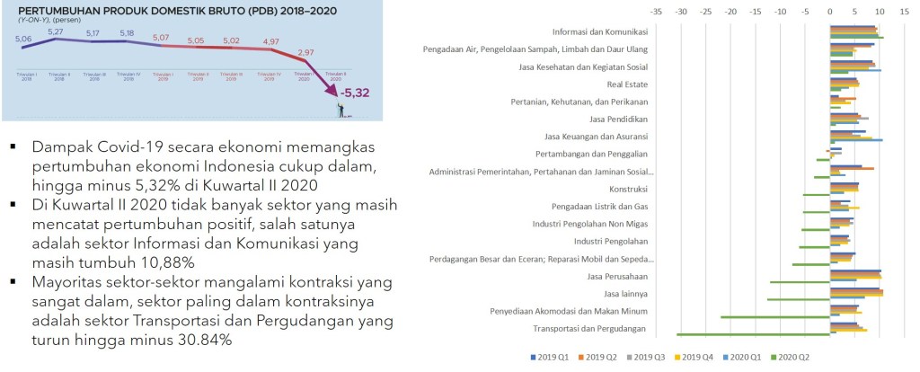 Dampak Covid-19 secara ekonomi memangkas pertumbuhan ekonomi Indonesia cukup dalammhingga minus 5,32% di Kuwartal II 2020. Di Kuwartal II 2020 tidak banyak sektor yang masih mencatat pertumbuhan positif, salah satunya adalah sektor Informasi dan Komunikasi yang masih tumbuh 10,88%. Mayoritas sektor-sektor mangalami kontraksi yang sangat dalam, sektor yang paling dalam kontraksinya adalah sektor Transportasi dan Pergudangan yang turun hingga minus 30.84%.