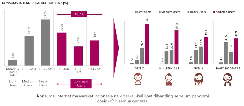 Pandemi mempercepat digitalisasi kehidupan kita, ketika akses komunikasi fisik semakin terbatas maka alternatifnya adalah beralih kepada komunikasi secara online. Data yang dicatat oleh Alvara Research Center dari survei bulan Juni 2020 menunjukkan adanya kenaikan yang sangat signifikan terkait konsumsi internet masyarakat Indonesia. Dalam satu hari mereka tidak lagi masuk dalam kategori heavy user (akses internet 4-6 jam) tapi mayoritas masuk dalam kategori addicted users, mereka adalah yang akses internet lebih dari 7 jam dalam sehari.