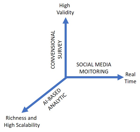 Dari pengalaman bergelut lebih dari 25 tahun di industri riset dan melihat trend yang sedang berkembang saat ini saya berhipotesa bahwa memang perlu ada pendekatan riset yang baru yakni dengan cara menggambungkan tiga pendekatan sekaligus yaitu survei konvensional, monitoring digital, dan kecerdasan buatan (AI).