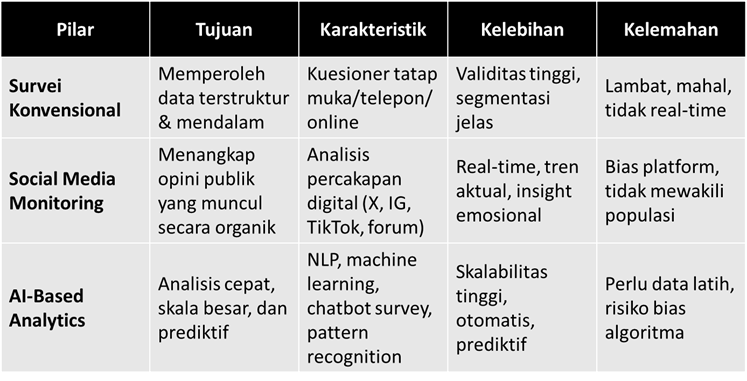 Karena itu, mengandalkan satu metode saja sudah tidaklah cukup. Survei konvensional memang rapi dan terstruktur, tapi lambat. Analisis media sosial cepat dan dinamis, tapi sering bias. Sementara AI bisa membantu kita memproses ribuan opini dalam hitungan menit, bahkan memprediksi tren yang belum terjadi.