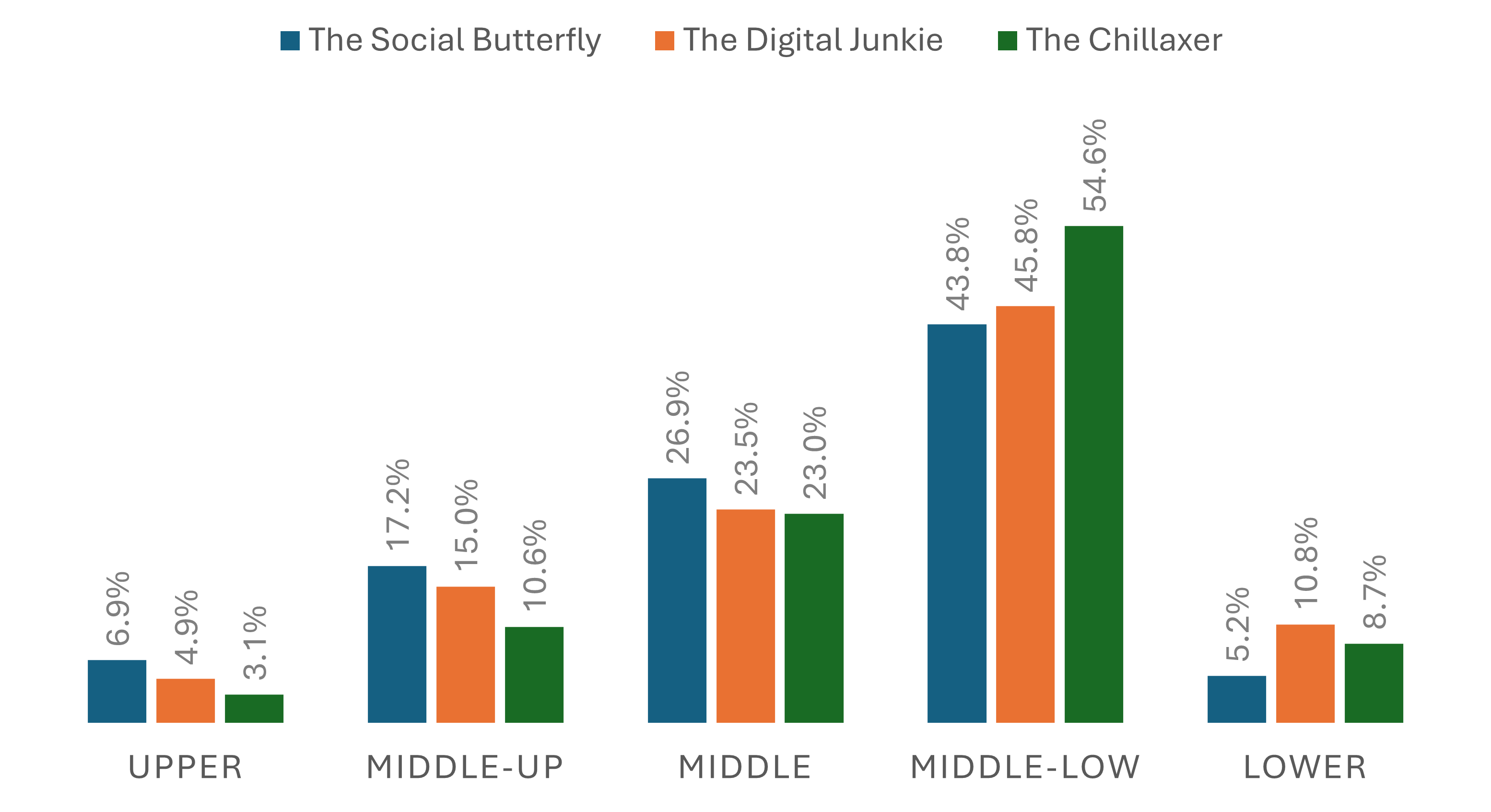 Lebih menarik lagi, persebaran berdasarkan kelas sosial ekonomi menunjukkan bahwa karakter ”Si Paling Eksis” lebih banyak ditemukan di kelas ekonomi menengah ke atas. Hal ini menunjukkan adanya hubungan antara kemapanan sosial ekonomi dengan munculnya karakter sosial-aktif yang inovatif dan berani tampil. Sementara ”Si Digital Banget” dan ”Si Santuy Banget” semakin mendominasi di kelas menengah dan menengah ke bawah