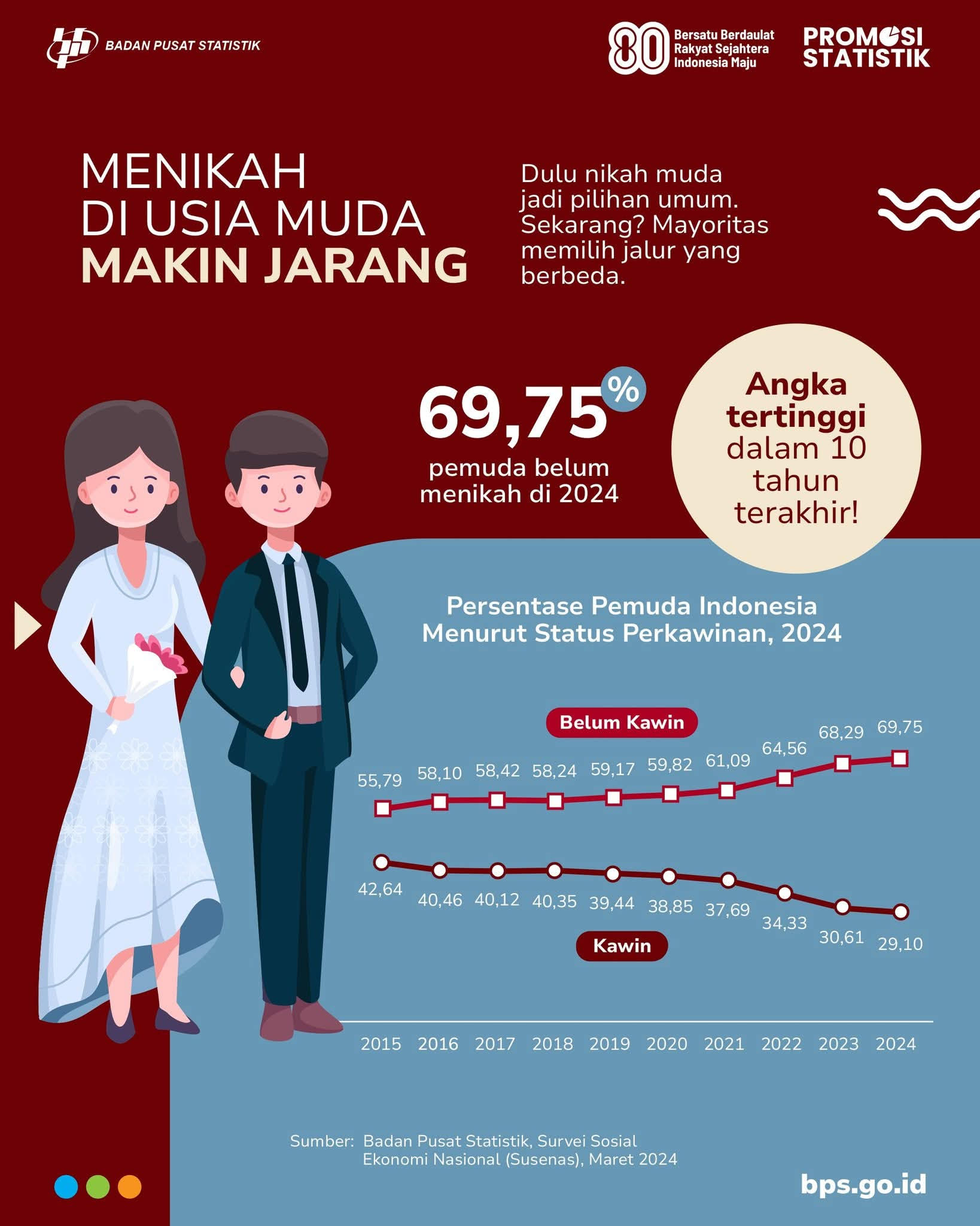 Pada tahun 2015, jumlah pemuda yang belum menikah masih 55,79%, sementara 42,64% sudah menikah. Perlahan tren itu berbalik arah terutama ditahun-tahun paska pandemi Covid-19. Di 2024, hanya 29,10% yang menikah, sementara mayoritas lainnya memilih tetap lajang.