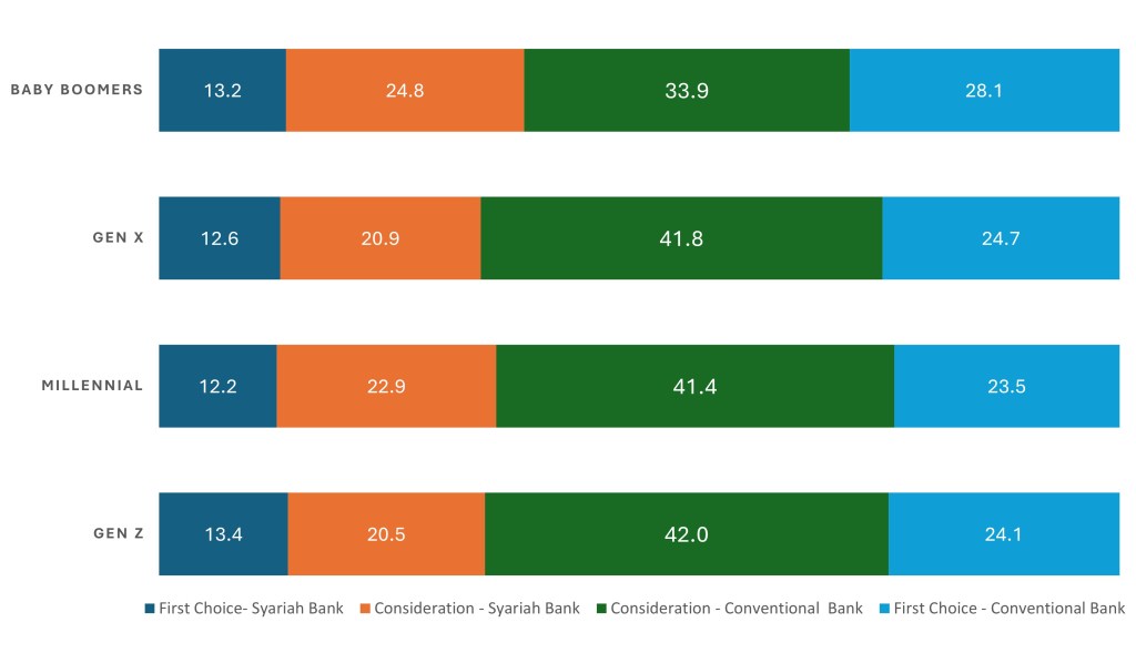 Survei nasional yang dilakukan Alvara Research Center pada bulan September 2025 juga mendapatkan temuan yang hampir senada. Survei yang membedah preferensi lintas generasi, Baby Boomers, Gen X, Milenial, dan Gen Z, mengungkap kenyataan bahwa pola pikir masyarakat terhadap bank syariah cenderung serupa. Dari generasi ke generasi, hanya sekitar 12 hingga 13 persen responden yang menempatkan bank syariah sebagai pilihan pertama. Sementara itu, sekitar 20 sampai 25 persen mengatakan mereka mempertimbangkan bank syariah. Sebaliknya, bank konvensional masih unggul dalam dua kategori: sekitar 34 hingga 42 persen responden mempertimbangkannya, dan sekitar 23 hingga 28 persen memilihnya sebagai bank utama.
