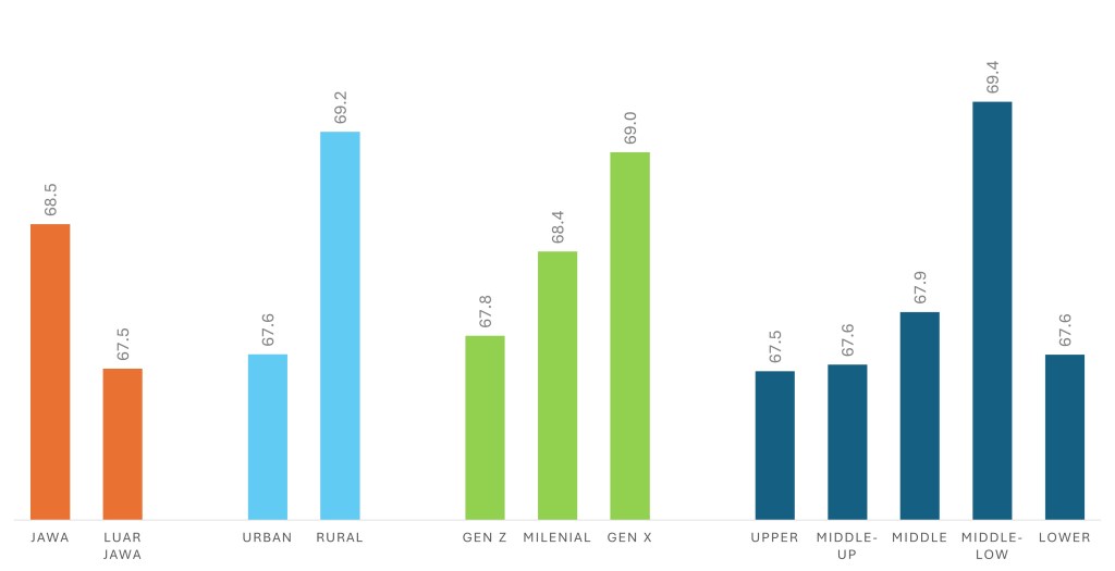 Hasilnya, Pertama, mari kita melihat dimensi wilayah. Warga NU di Jawa memiliki skor indeks 68,5, sedikit lebih tinggi dibanding warga NU di luar Jawa yang berada pada angka 67,5. Perbedaannya memang tidak terlalu mencolok, tetapi tetap memberi sinyal bahwa pusat gravitasi identitas NU masih berada di Jawa, tempat NU lahir dan tumbuh dalam konteks kebudayaan pesantren dan tradisi Islam Nusantara yang kuat. Warga NU di wilayah rural memiliki skor tertinggi hingga 69,2, melampaui warga urban yang berada pada angka 67,6. Data ini menunjukkan bahwa kedalaman praktik dan identitas keagamaan khas NU masih sangat terjaga di desa-desa. Rural tidak sekadar lokasi geografis, ia adalah ekosistem kultural yang menopang tradisi, takzim pada kiai, dan jejaring pesantren yang menjadi napas NU sejak awal berdiri.