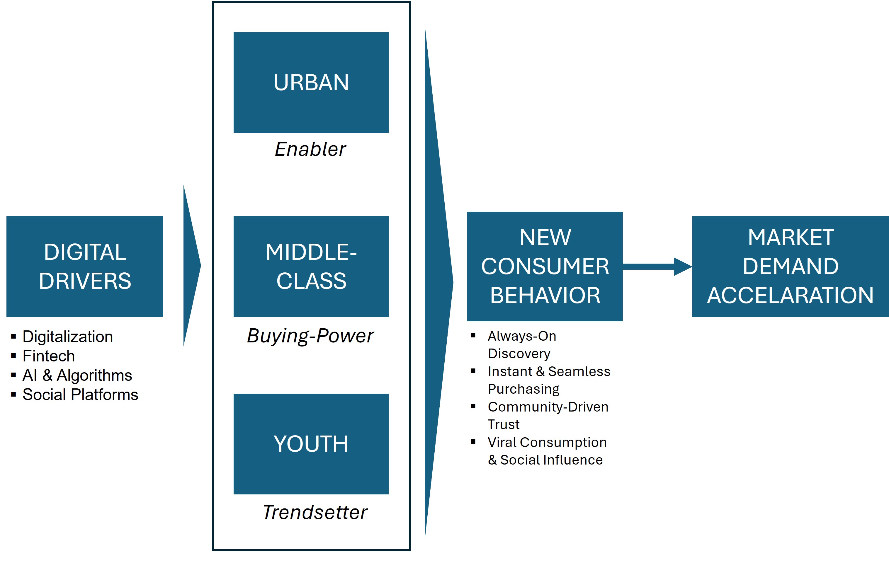 Digitalisasi adalah pintu masuknya dan menjadi driver utama. Ketika semua orang membawa internet di saku masing-masing, perilaku konsumsi berubah drastis. Konsumen kini tidak lagi bergantung pada satu sumber informasi. Mereka memeriksa ulasan, menonton konten kreator, membandingkan harga real-time, sekaligus mencari pembuktian sosial sebelum membeli. Mereka ingin tahu apa kata orang lain, bukan apa kata iklan. Karena itu digital tidak hanya mengubah cara orang mengakses produk, tetapi juga cara mereka membangun kepercayaan. Dalam masyarakat digital, reputasi bisa naik dalam satu hari, tetapi bisa runtuh dalam satu jam. Pasar menjadi lebih dinamis, penuh kejutan, dan bisa terjadi perubahan secara tak terduga.