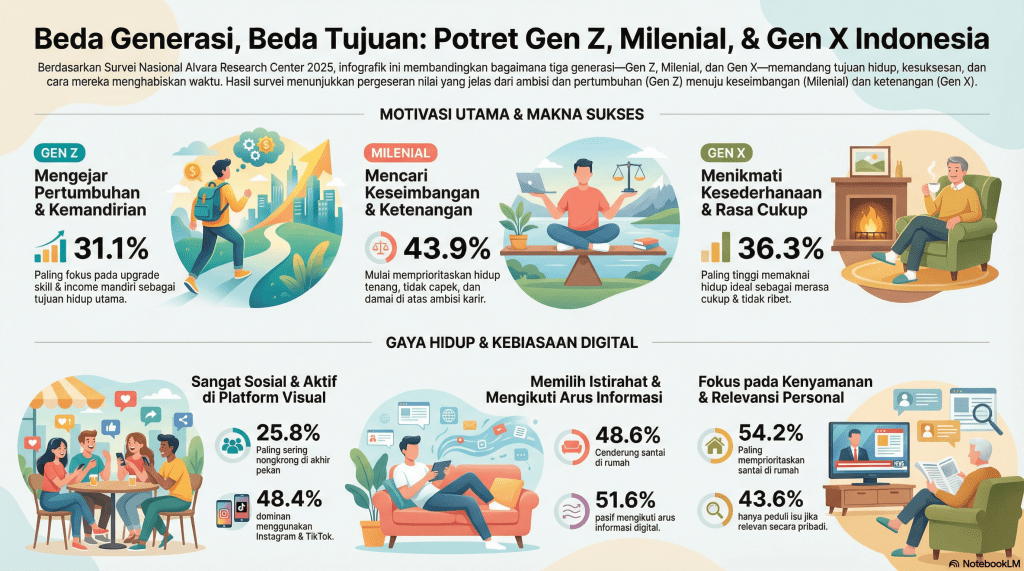 Survei nasional Alvara Research Center tahun 2025 memberi gambaran yang cukup jelas tentang jarak ini. Gen Z, Milenial, dan Gen X hidup dalam konteks sosial dan ekonomi yang sama, tetapi membawa tujuan hidup yang berbeda. Perbedaan itu bukan sekadar soal selera, melainkan cerminan fase hidup dan pengalaman kolektif yang tidak sama.