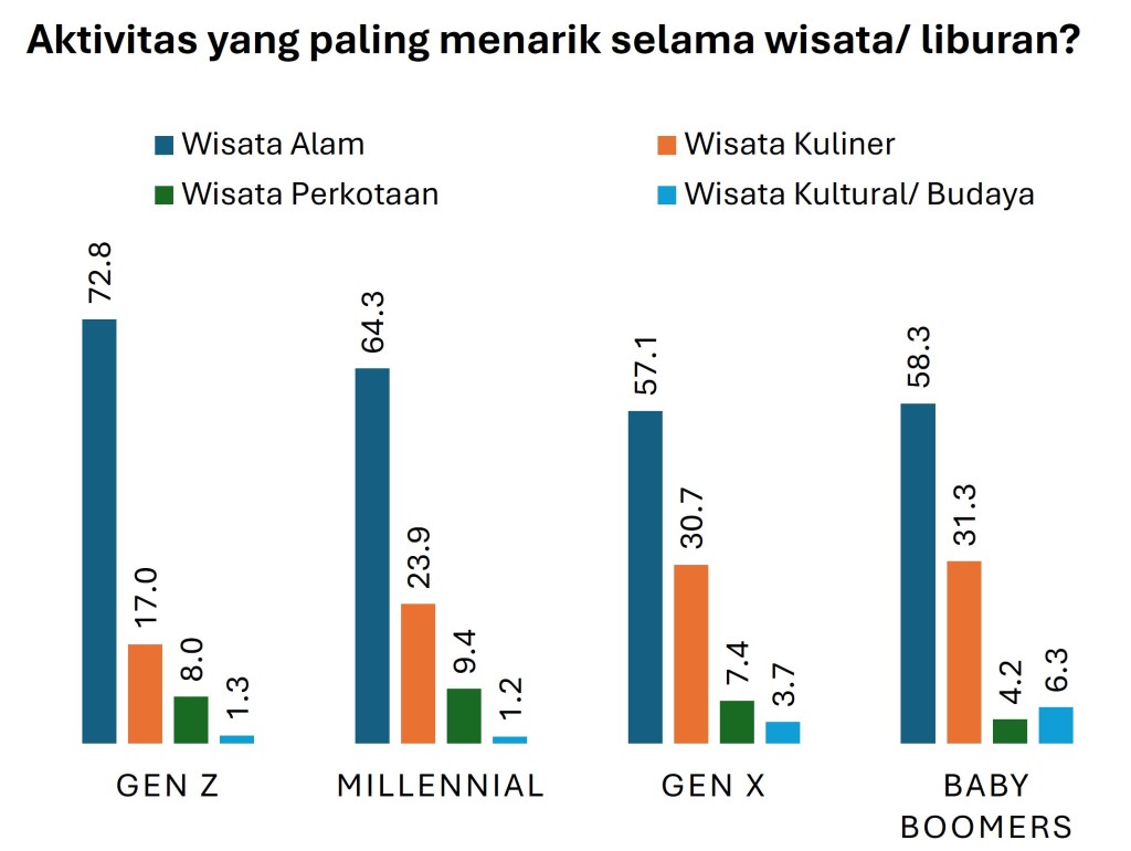 Satu temuan paling menarik dari data Alvara adalah dominasi wisata alam di semua generasi. Sebanyak 72,8 persen Gen Z, 64,3 persen Milenial, 57,1 persen Gen X, dan 58,3 persen Baby Boomers menyebut wisata alam sebagai aktivitas paling menarik.