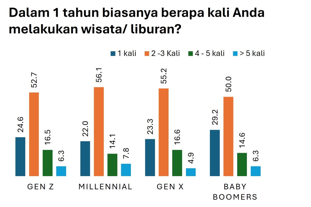 Data Alvara menunjukkan bahwa mayoritas masyarakat Indonesia, dari Gen Z hingga Baby Boomers, melakukan wisata 2–3 kali dalam setahun. Pola ini konsisten di semua generasi, dengan proporsi lebih dari 50 persen responden berada di kategori tersebut. Artinya, wisata sudah menjadi aktivitas yang cukup rutin untuk direncanakan, tetapi tidak berlebihan.
