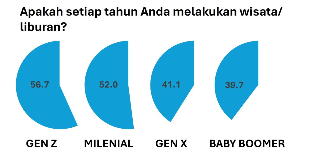 Generasi muda, khususnya Gen Z, adalah kelompok yang paling konsisten melakukan wisata tahunan. Namun menariknya, mereka bukan yang paling ekstrem. Hanya 6,3 persen Gen Z yang berwisata lebih dari lima kali setahun. Mayoritas tetap berada di kategori moderat.