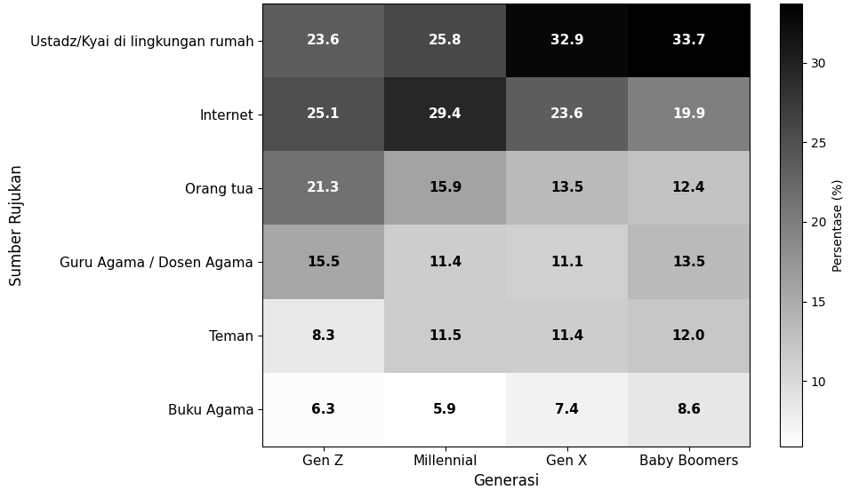 Gen X, yang kini banyak berada di posisi sebagai penopang keluarga dan pengambil keputusan di organisasi, menunjukkan pola yang lebih mendekati generasi tua. Rujukan kepada ustadz atau kyai lokal mencapai 32,9 persen, jauh di atas internet yang hanya 23,6 persen. Ini menunjukkan bahwa meskipun Gen X tidak asing dengan teknologi, dalam urusan agama mereka tetap menempatkan figur otoritatif berbasis komunitas sebagai rujukan utama.