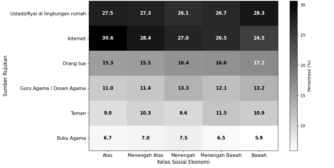 Bagaimana bila dibedah dalam dimensi kelas sosial ekonomi?. Ternyata realitasnya menjadi lebih kompleks. Di kelas atas, internet menjadi sumber informasi keagamaan tertinggi dengan porsi 30,6 persen, sementara rujukan kepada ustadz atau kyai lokal berada di angka 27,5 persen. Pada kelas menengah atas, polanya relatif serupa. Ini menunjukkan bahwa pada kelompok dengan akses pendidikan dan teknologi yang lebih tinggi, pencarian informasi keagamaan cenderung lebih mandiri dan berbasis media.