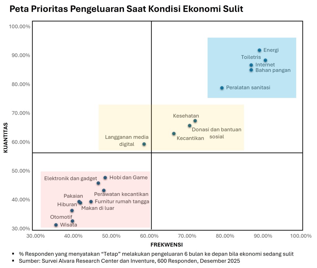 Setiap kali ekonomi melambat, satu pertanyaan sederhana selalu muncul di masyarakat kita adalah pengeluaran mana yang harus dikurangi, dan mana yang harus dipertahankan? Survei yang dilakukan oleh Alvara Research Center dan Inventure pada bulan Desember 2025 memberikan gambaran yang jelas tentang prioritas pengeluaran masyarakat Indonesia bila kondisi ekonomi menghadapi tekanan.