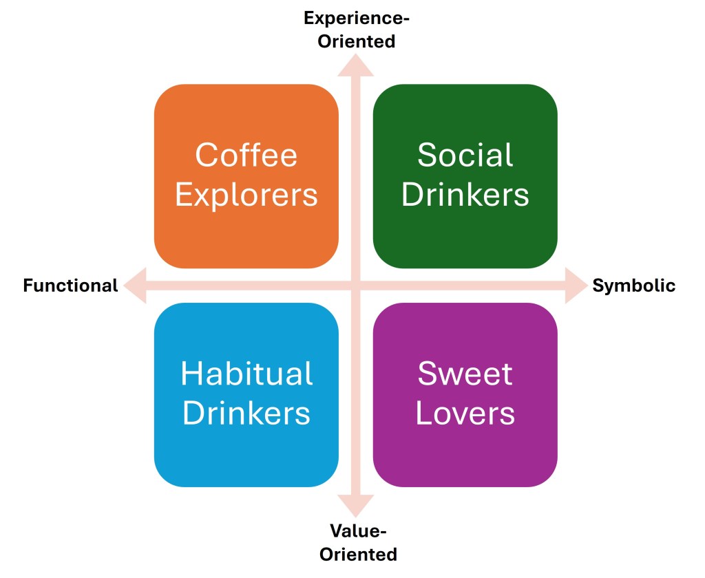 - Sweet Lovers, peminum kopi yang tetap berangkat dari orientasi kepraktisan tetapi mulai memberi ruang pada kenikmatan. Kopi dipilih karena rasa yang mudah diterima, manis, dan menyenangkan, sering kali dalam bentuk kopi susu, RTD, atau minuman literan. Banyak di antara mereka sebelumnya bukan peminum kopi, namun masuk ke kategori kopi melalui pintu rasa dan kemudahan.